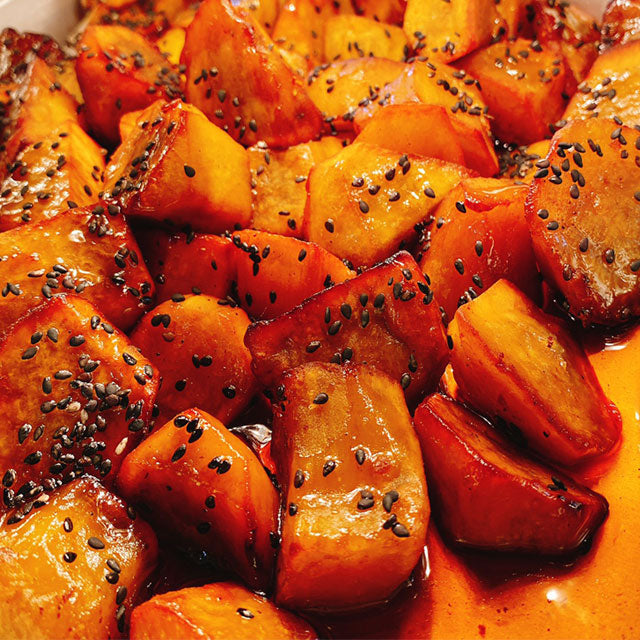 その秘密はやっぱり焼き芋。焼き芋にしたほくほく紅あずまを二度揚げし、しっとりしたタレでからめています。かちかちで歯にはさまってしまうようなタイプではなく、しっとりした当店の大学芋がご自宅で楽しめます。